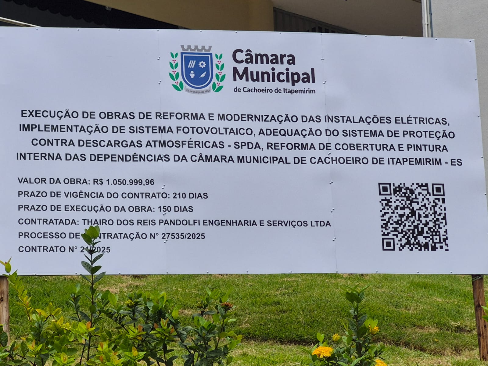 Reforma e modernização das instalações elétricas, implantação de sistema fotovoltaico, adequação do Sistema de Proteção contra Descargas Atmosféricas – SPDA, Reforma de cobertura e Pintura interna das dependências da Câmara Municipal de Cachoeiro de Itapemirim. |